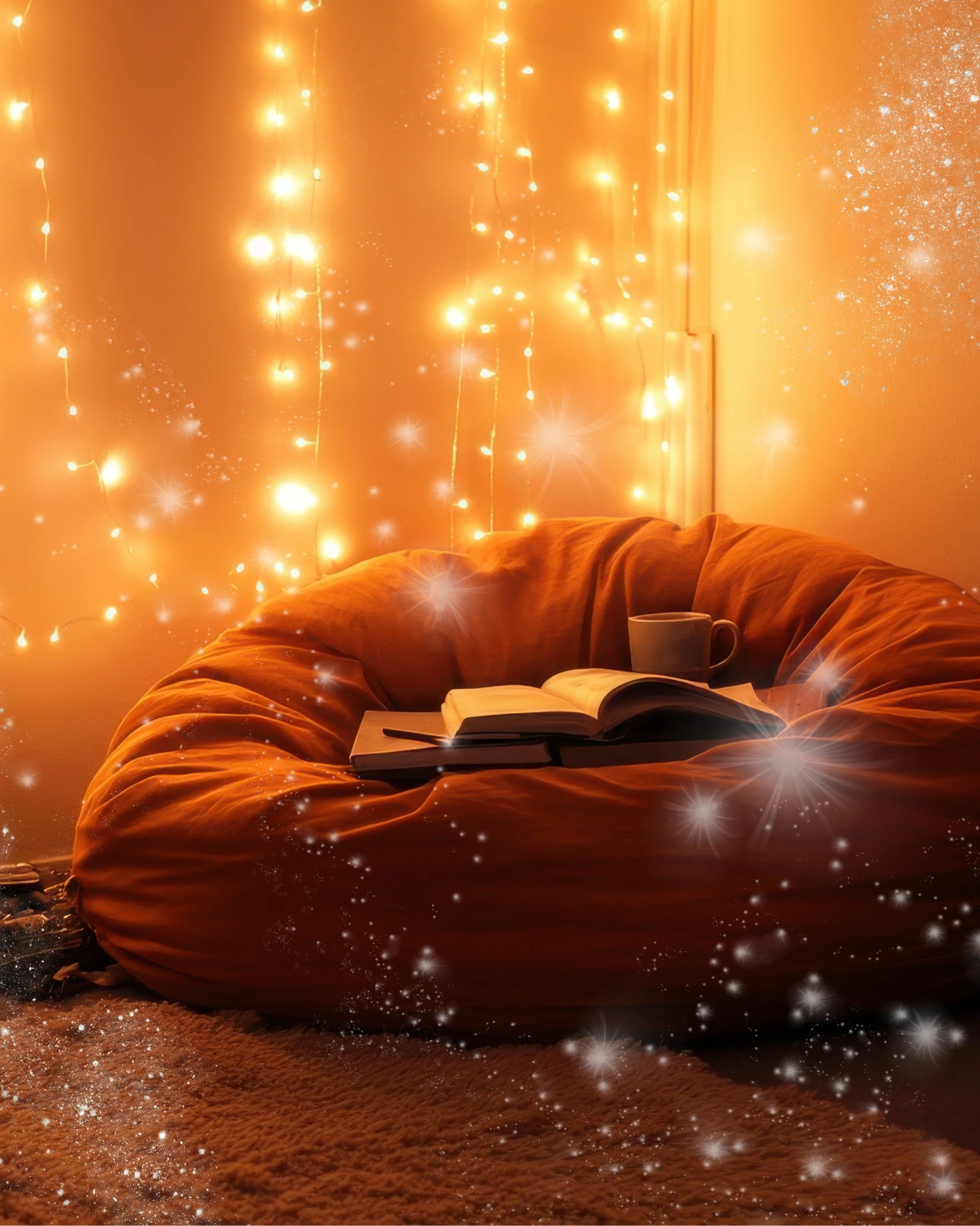 I’m in the process of making little spots of cozy throughout my house. I’ve set up cloud lights in my bedroom, right above my bed. They cast a magical glow and can even blink and dance along to music. I bought an over-sized memory foam chair I plan to set up in my walk-in closet (as soon as I’ve wrapped all the gifts stored in there) and hang some string lights. Because sometimes I wake up in the middle of the night and all kinds of wonderful poems and book ideas come to me. But I don’t want to disturb my partner by turning on a light and writing in bed. And I also don’t want to go out into the living room and wake the dogs, the cats, the boys. So a little closet hide-away just seems like the perfect answer.